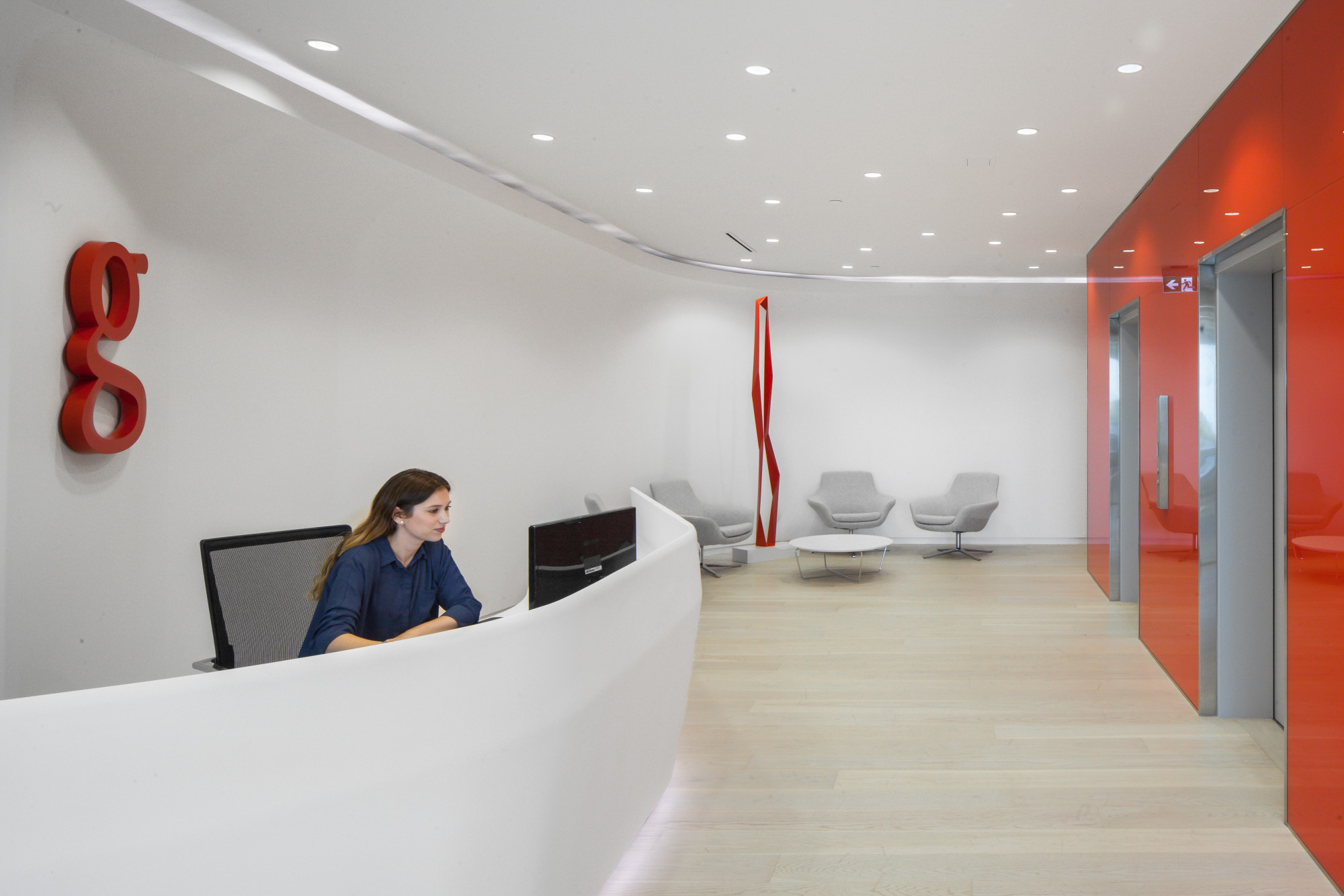 The reception area features custom fabricated curvilinear partitions and reception desk, evocative of the dynamic and fast-paced yet solid ethos of the company. A stripped down colour palette reinforces the Greybrook brand, while subtle features such as wood grain flooring and soft textiles create a welcoming atmosphere for clients. The project involved the design of custom millwork, selection of furniture and equipment, and exacting interior finishes detailing.