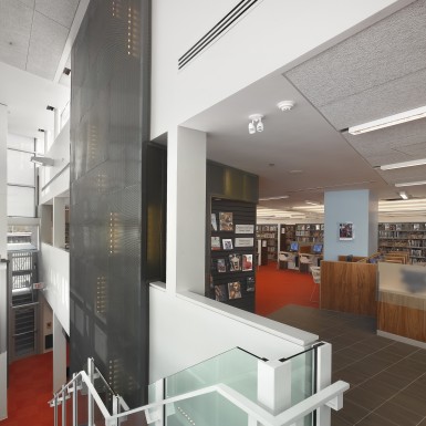 One of the main architectural improvements to the library is better defined circulation routes. Patrons entering form the corner of Jane and Dundas streets ascend through the gallery to the one-point entrance in front of the circulation desk. The new library serves as a safe and vibrant place for existing and future generations of readers.