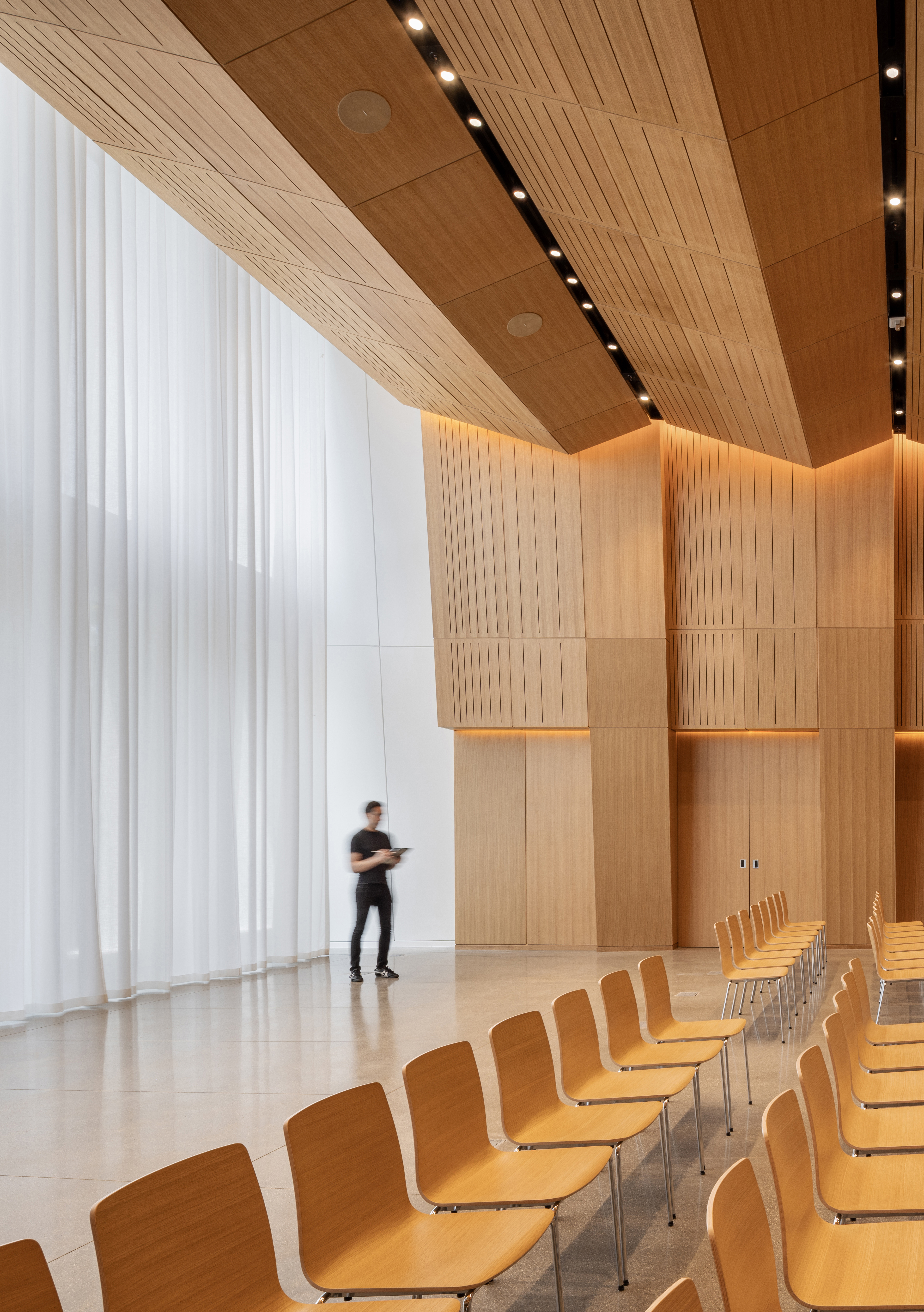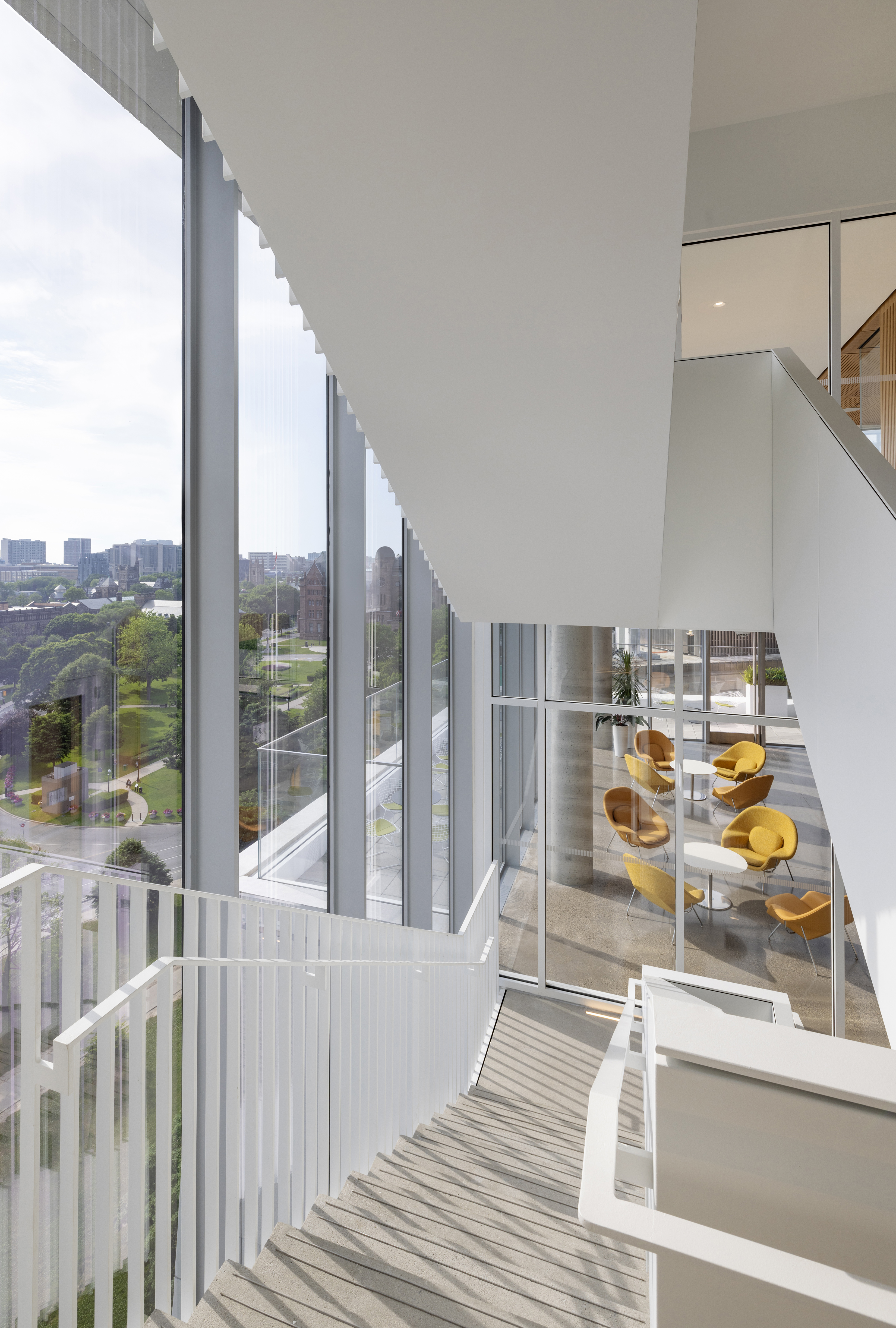 The Schwartz Reisman Innovation Centre at the University of Toronto (U of T) is located in the City of Toronto’s Discovery District on the eastern edge of the U of T campus. The program includes new space for a variety of existing and future University entrepreneurial tenants, including the Vector Institute of Artificial Intelligence and many health related start-ups, working in partnership with similar facilities in the neighbouring MaRS research centre and the various hospitals in the area. A group of public engagement and shared spaces on the lower floors, including large event spaces, instructional rooms, seminar rooms and an exhibition lobby, foster collaboration, encourage exchange and build a community of innovators. Two multi-storey winter garden spaces, on the 7th and 10th floors, provide additional informal collaboration and presentation areas for all building users, with access to adjacent roof terraces and provide views to the City core and the adjacent Legislature buildings. The building’s dynamic tapered form acts as the east half of an informal gateway to the campus and to the Queen’s Park area.
