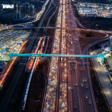 Aerial view of the Pickering GO Pedestrian Bridge looking west toward the downtownToronto skyline. The bridge traverses 6 railway lines and 14 lanes of traffic across Highway 401, North America’s busiest highway, and to connect the Town of Pickering to its main transit hub. Photo by Michael Muraz.