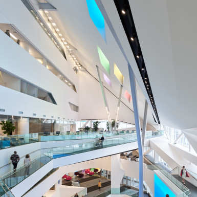 The new building envelope is composed of durable, high-performance zinc with generous expanses of glazing. Its dynamic form was conceived to relate directly to its urban context—literally stretching out and opening up toward nearby landmarks. The building’s skin in turn shapes a network of intuitive circulation paths and inspiring new spaces.