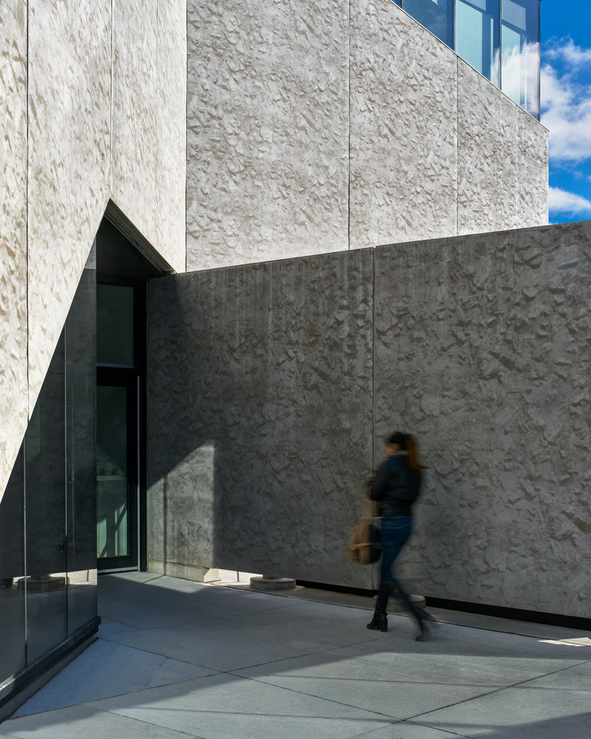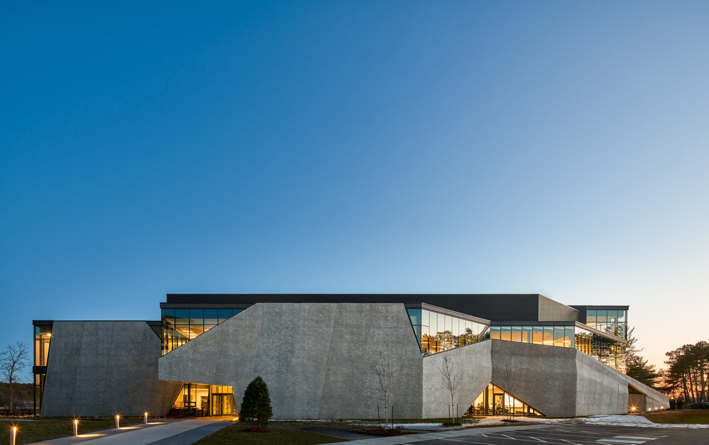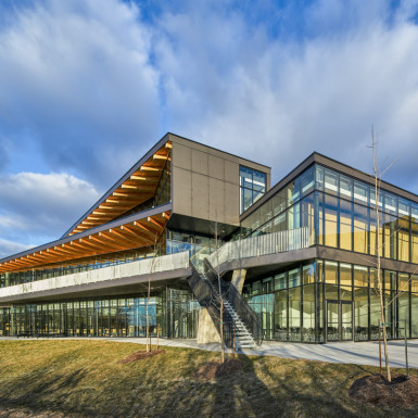 The new Trent University Student Centre was designed to address two key aims: connecting students to the beautiful adjacent river landscape; and connecting students to one another. The building’s main entrance directly addresses the bus stop at the principal entry to campus, leading to a picturesque river walk via a new indoor student forum. Another entrance connects the pedestrian path along the campus entry road to the river walk. Together these paths form an ‘X’, centred at the focal point of the forum. The forum is a multi-height gathering space from which all activities of the building are visible together with a breathtaking panorama of the river. It is an indoor/outdoor space with a patio and upper level terrace. It is served with coffee and snacks and offers a wide variety of study and interaction areas. A unique feature of the facility is that it combines both and student centre and teaching and learning facilities, ensuring that it is well used over the course of each day. Its unique photo-etched precast concrete exterior finish was created from an image of the original rough aggregate concrete used in the campus’ iconic historic buildings, which, in conjunction with wood roof detailing, serves to connect to the architecture of the original campus.